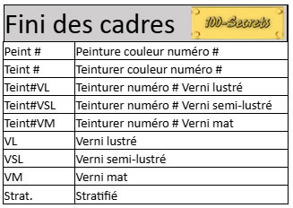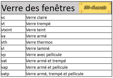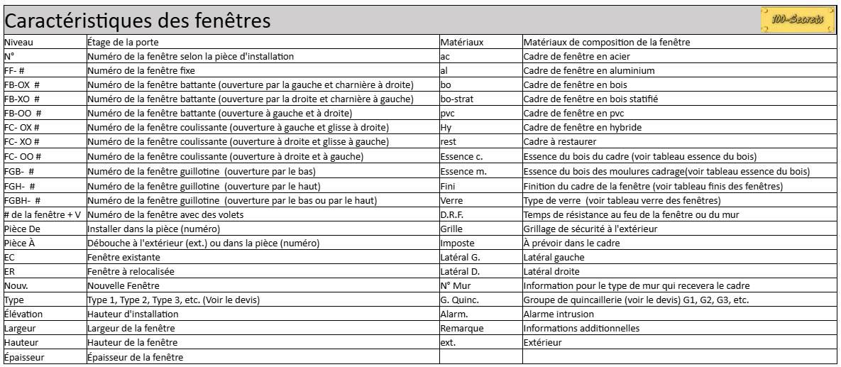 | Exemple des tableaux des caractéristiques, des bordereaux et des légendes pour les fenêtres |